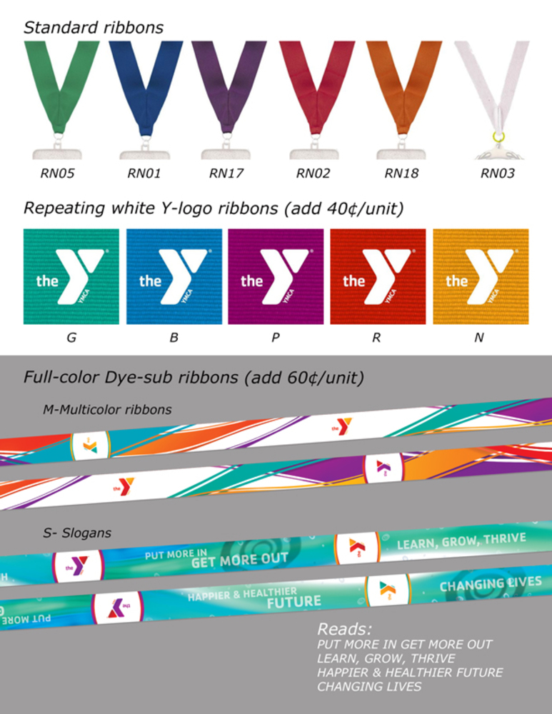 Choose from 13 different ribbon styles: solid unimprinted are FREE—choose Y Logo or new Dye-sublimated Ribbons for a small extra charge.